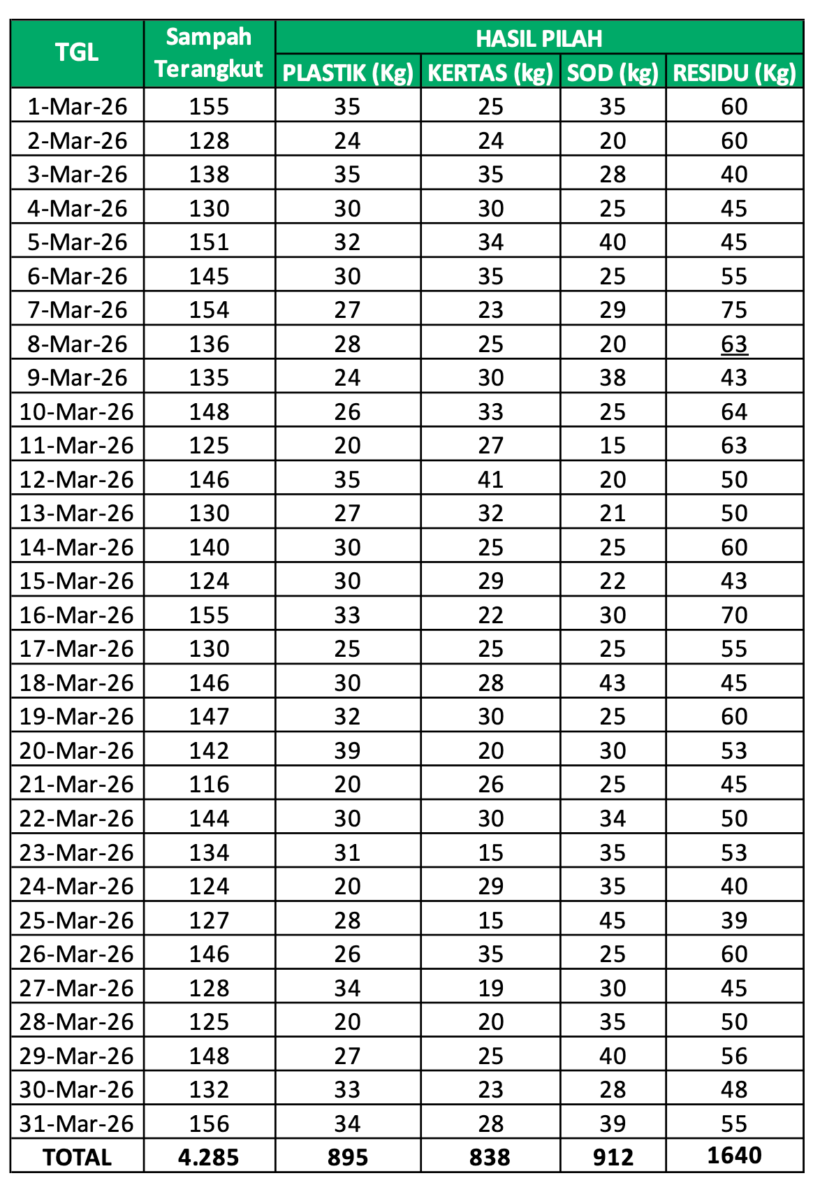 DASHBOARD MARET SAMPAH TERANGKUT PLASTIK KERTAS SOD RESIDU SATUAN KG 0 SATUAN KG 0 SATUAN KG 0 SATUAN KG 0 SATUAN KG 0 PEMILAHAN SAMPAH DATA SAMPAH BAGAN SAMPAH No Data Found REKAP BULANAN No Data Found Produk akhir sampah yang diolah : Note: Sampah residu McD Yogyakarta diolah zero waste oleh PT Bolomas Berdikari, di Panggungharjo, Sewon, Kabupaten Bantul, Yogyakarta. DOKUMENTASI BACK TO DASHBOARD