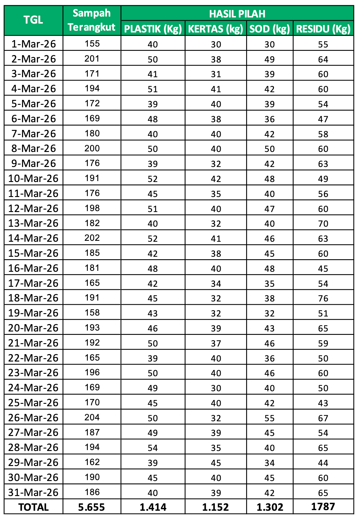 DASHBOARD MARET SAMPAH TERANGKUT PLASTIK KERTAS SOD RESIDU SATUAN KG 0 SATUAN KG 0 SATUAN KG 0 SATUAN KG 0 SATUAN KG 0 PEMILAHAN SAMPAH DATA SAMPAH BAGAN SAMPAH No Data Found REKAP BULANAN No Data Found Produk akhir sampah yang diolah : Note: Sampah residu McD Yogyakarta diolah zero waste oleh PT Bolomas Berdikari, di Panggungharjo, Sewon, Kabupaten Bantul, Yogyakarta. DOKUMENTASI BACK TO DASHBOARD