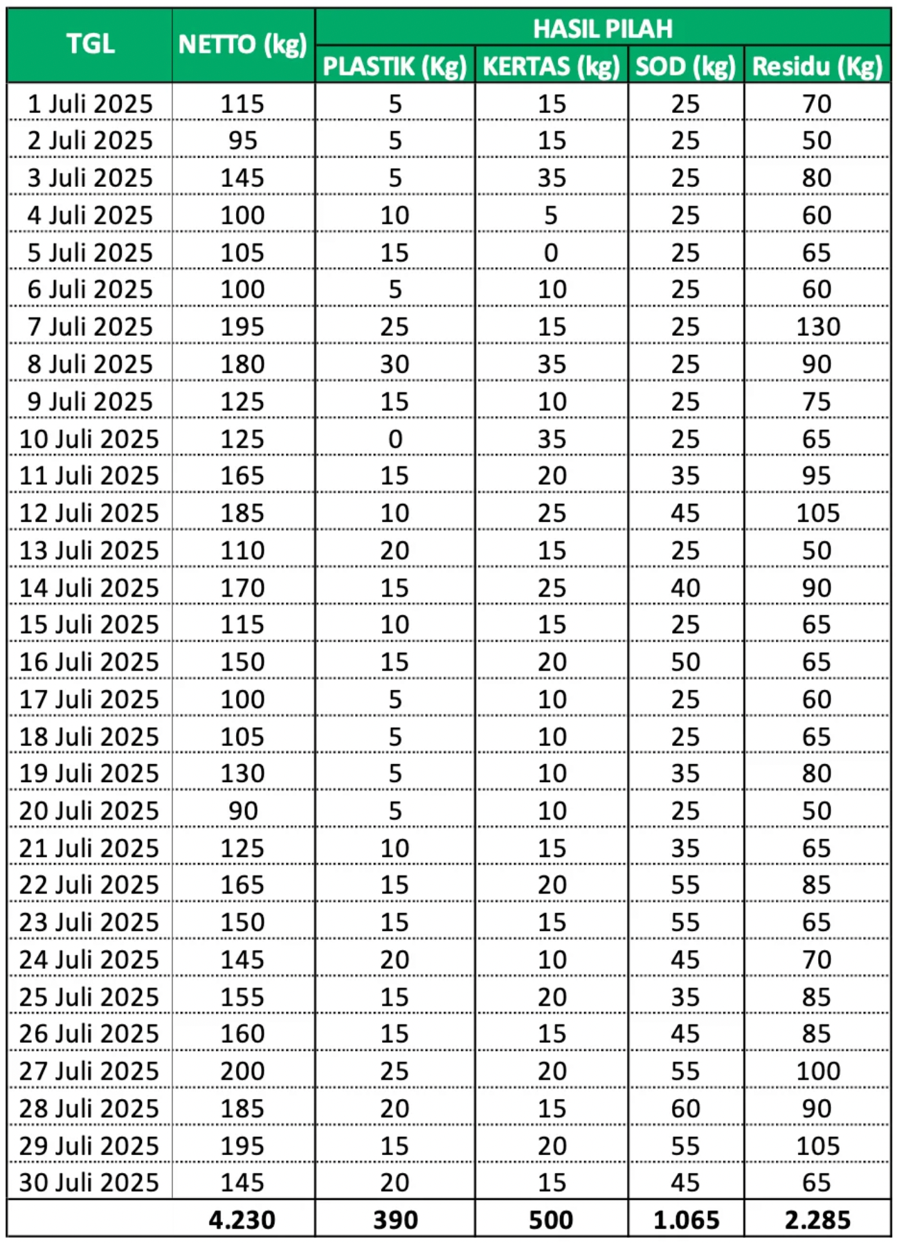 DASHBOARD JULI SAMPAH TERANGKUT PLASTIK KERTAS SOD RESIDU SATUAN KG 0 SATUAN KG 0 SATUAN KG 0 SATUAN KG 0 SATUAN KG 0 PEMILAHAN SAMPAH DATA SAMPAH BAGAN SAMPAH No Data Found REKAP BULANAN No Data Found Produk akhir sampah yang diolah : Note: Sampah residu McD Yogyakarta diolah zero waste oleh PT Bolomas Berdikari, di Panggungharjo, Sewon, Kabupaten Bantul, Yogyakarta. DOKUMENTASI BACK TO DASHBOARD