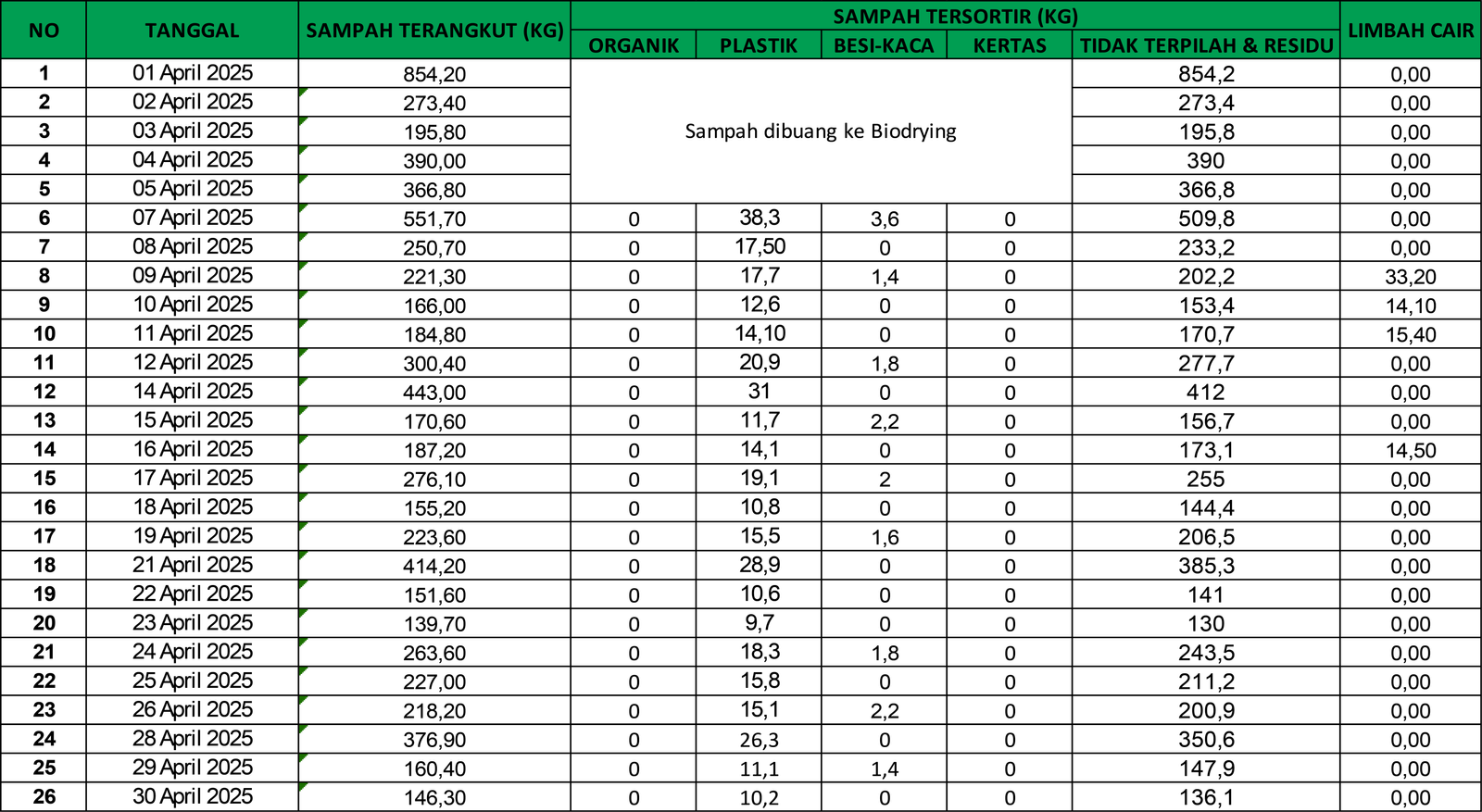 DASHBOARD APRIL SAMPAH TERANGKUT PLASTIK BESI - KACA TIDAK TERPILAH & RESIDU LIMBAH CAIR SATUAN KG 0 SATUAN KG 0 SATUAN KG 0 SATUAN KG 0 SATUAN KG 0 PEMILAHAN SAMPAH DATA SAMPAH BAGAN SAMPAH No Data Found REKAP BULANAN No Data Found DOKUMENTASI BACK TO DASHBOARD