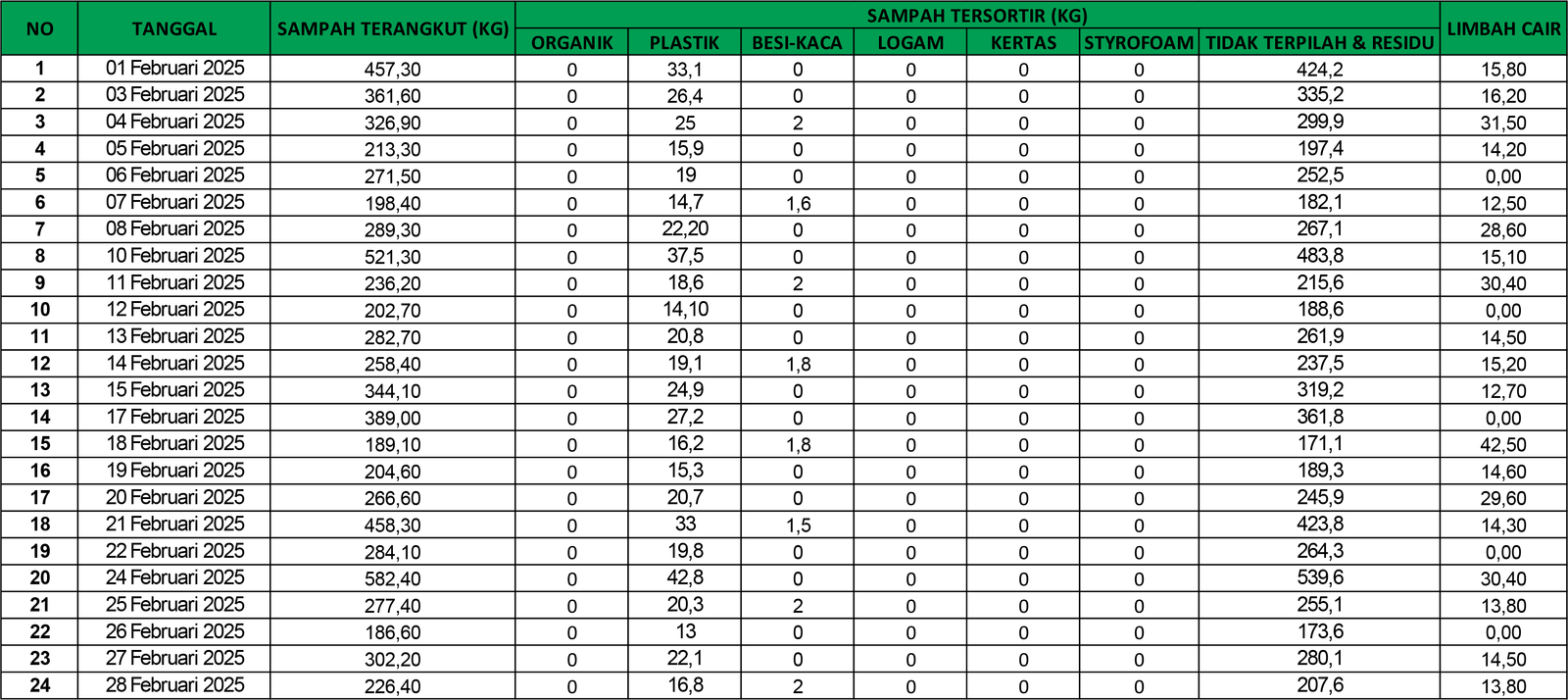 DASHBOARD FEBRUARI SAMPAH TERANGKUT PLASTIK BESI - KACA TIDAK TERPILAH & RESIDU LIMBAH CAIR SATUAN KG 0 SATUAN KG 0 SATUAN KG 0 SATUAN KG 0 SATUAN KG 0 PEMILAHAN SAMPAH DATA SAMPAH BAGAN SAMPAH No Data Found REKAP BULANAN No Data Found DOKUMENTASI BACK TO DASHBOARD