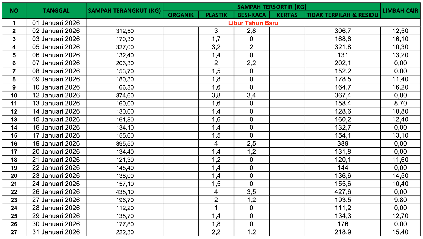 DASHBOARD JANUARI SAMPAH TERANGKUT PLASTIK BESI - KACA TIDAK TERPILAH & RESIDU LIMBAH CAIR SATUAN KG 0 SATUAN KG 0 SATUAN KG 0 SATUAN KG 0 SATUAN KG 0 PEMILAHAN SAMPAH DATA SAMPAH BAGAN SAMPAH No Data Found REKAP BULANAN No Data Found Produk akhir sampah yang diolah : Note: Sampah residu McD Jakarta di olah jadi zero waste oleh PT Indocement Tunggal Perkasa di Citerep Kabupaten Bogor. DOKUMENTASI BACK TO DASHBOARD