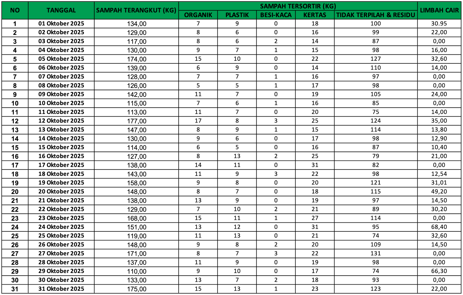 DASHBOARD OKTOBER SAMPAH TERANGKUT PLASTIK BESI - KACA TIDAK TERPILAH & RESIDU LIMBAH CAIR SATUAN KG 0 SATUAN KG 0 SATUAN KG 0 SATUAN KG 0 SATUAN KG 0 PEMILAHAN SAMPAH DATA SAMPAH BAGAN SAMPAH No Data Found REKAP BULANAN No Data Found Produk akhir sampah yang diolah : Note: Sampah residu McD Jakarta di olah jadi zero waste oleh PT Indocement Tunggal Perkasa di Citerep Kabupaten Bogor. BACK TO DASHBOARD