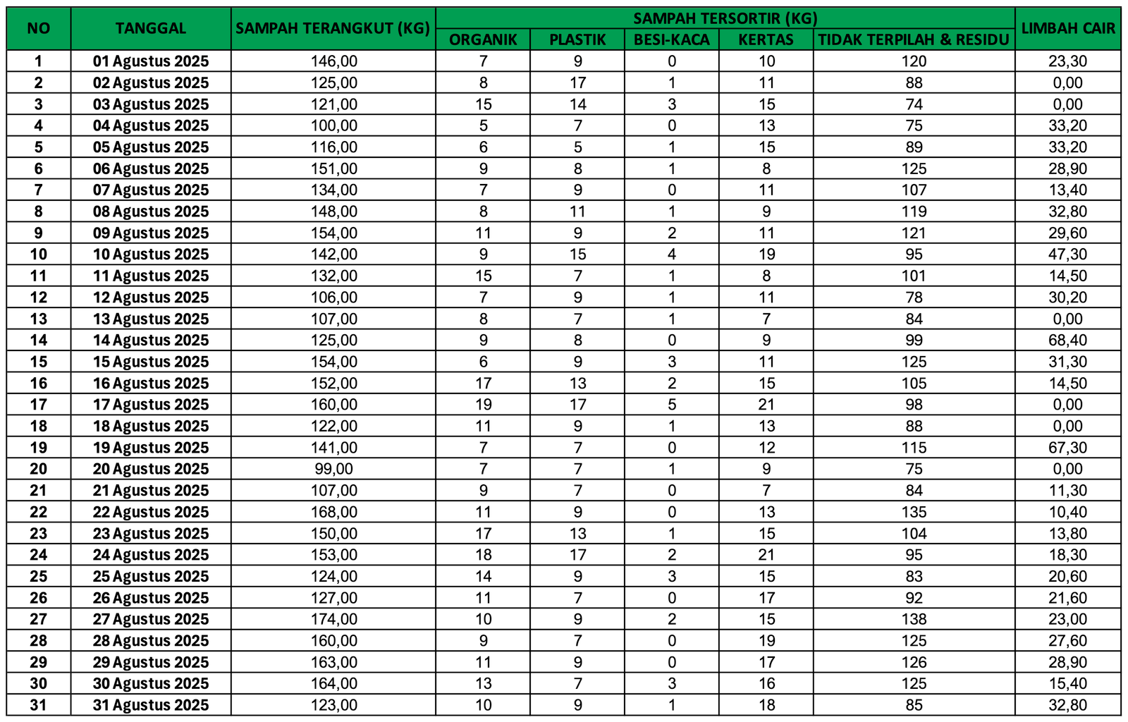 DASHBOARD JULI SAMPAH TERANGKUT PLASTIK BESI - KACA TIDAK TERPILAH & RESIDU LIMBAH CAIR SATUAN KG 0 SATUAN KG 0 SATUAN KG 0 SATUAN KG 0 SATUAN KG 0 PEMILAHAN SAMPAH DATA SAMPAH BAGAN SAMPAH No Data Found REKAP BULANAN No Data Found Produk akhir sampah yang diolah : Note: Sampah residu McD Jakarta di olah jadi zero waste oleh PT Indocement Tunggal Perkasa di Citerep Kabupaten Bogor. DOKUMENTASI BACK TO DASHBOARD
