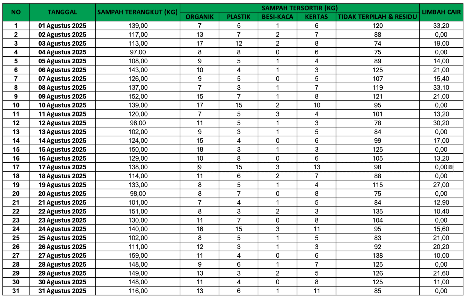 DASHBOARD AGUSTUS SAMPAH TERANGKUT PLASTIK BESI - KACA TIDAK TERPILAH & RESIDU LIMBAH CAIR SATUAN KG 0 SATUAN KG 0 SATUAN KG 0 SATUAN KG 0 SATUAN KG 0 PEMILAHAN SAMPAH DATA SAMPAH BAGAN SAMPAH No Data Found REKAP BULANAN No Data Found Produk akhir sampah yang diolah : Note: Sampah residu McD Jakarta di olah jadi zero waste oleh PT Indocement Tunggal Perkasa di Citerep Kabupaten Bogor. DOKUMENTASI BACK TO DASHBOARD