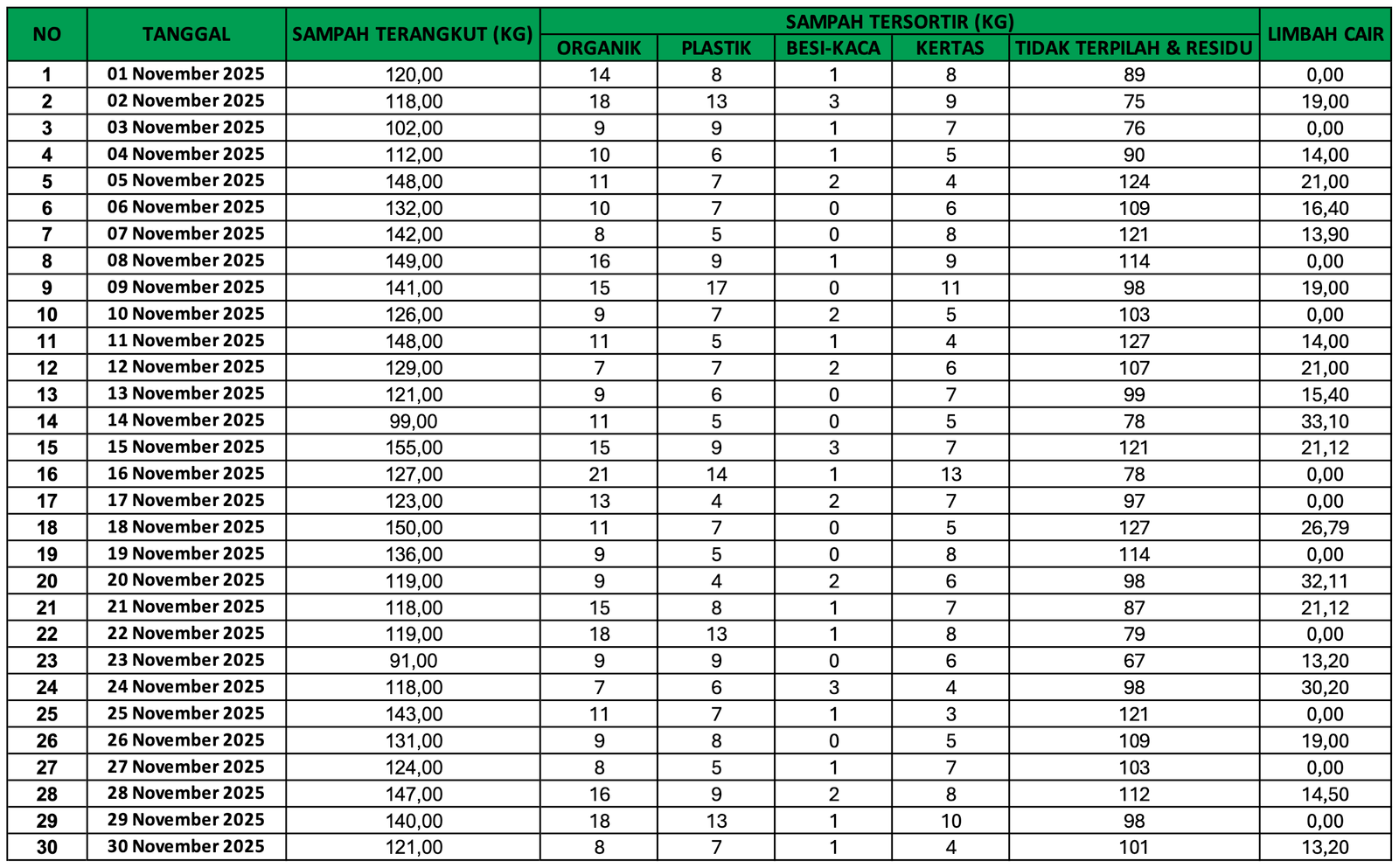DASHBOARD NOVEMBER SAMPAH TERANGKUT PLASTIK BESI - KACA TIDAK TERPILAH & RESIDU LIMBAH CAIR SATUAN KG 0 SATUAN KG 0 SATUAN KG 0 SATUAN KG 0 SATUAN KG 0 PEMILAHAN SAMPAH DATA SAMPAH BAGAN SAMPAH No Data Found REKAP BULANAN No Data Found Produk akhir sampah yang diolah : Note: Sampah residu McD Jakarta di olah jadi zero waste oleh PT Indocement Tunggal Perkasa di Citerep Kabupaten Bogor. BACK TO DASHBORD