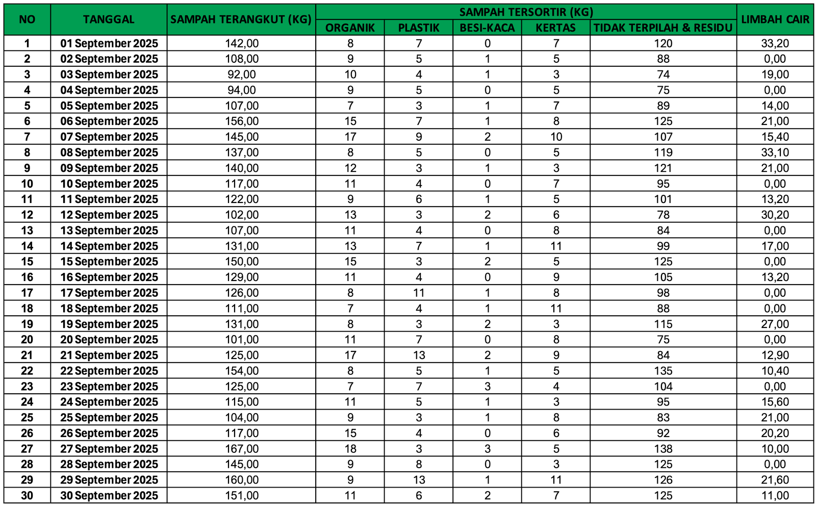 DASHBOARD SEPTEMBER SAMPAH TERANGKUT PLASTIK BESI - KACA TIDAK TERPILAH & RESIDU LIMBAH CAIR SATUAN KG 0 SATUAN KG 0 SATUAN KG 0 SATUAN KG 0 SATUAN KG 0 PEMILAHAN SAMPAH DATA SAMPAH BAGAN SAMPAH No Data Found REKAP BULANAN No Data Found Produk akhir sampah yang diolah : Note: Sampah residu McD Jakarta di olah jadi zero waste oleh PT Indocement Tunggal Perkasa di Citerep Kabupaten Bogor. BACK TO DASHBORD